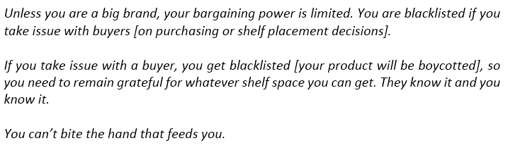 Suppliers generally report that they are unable to contest their contract terms, as they will simply be ‘blacklisted’ and their products ‘de-listed’ and no longer stocked by a supermarket. Below are typical comments made by suppliers, illustrating the enormous power that supermarkets enjoy: