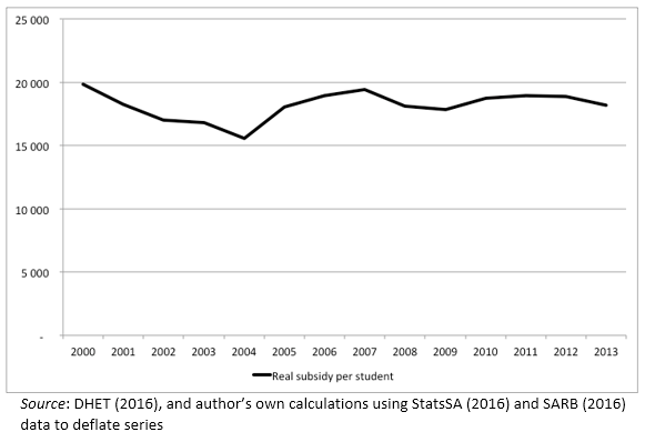 However, a falling subsidy ratio does not necessarily mean that subsidies have declined in absolute rand terms (whether in nominal or in real, inflation-adjusted terms). Neither does it mean that subsidies have fallen in per-student terms. Moreover, the subsidy-to-income ratio could also have fallen simply because, for whatever reason, the denominator (income) increased faster than the numerator. This is indeed what happened.