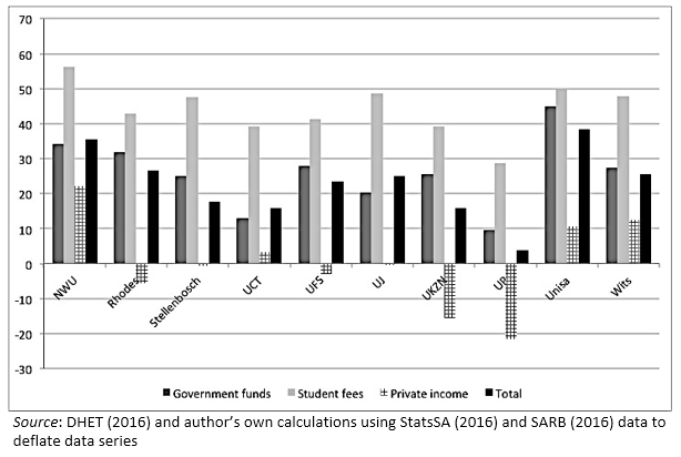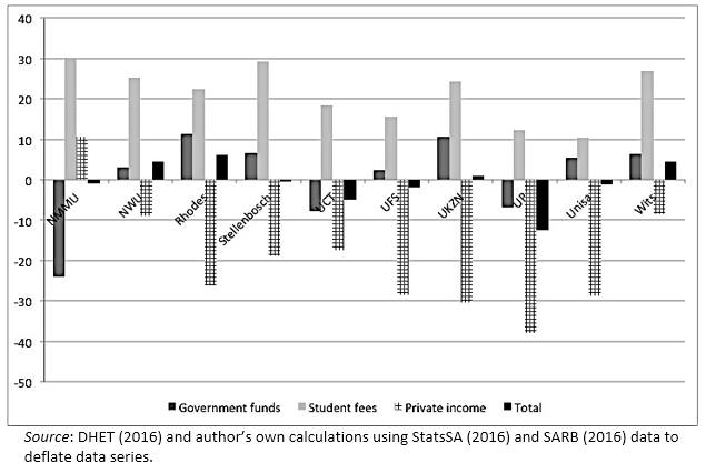Universities have to import books, subscribe to international journals, pay page fees for articles published by academic staff in international journals, buy imported equipment for laboratories and software for research and teachings. All these are directly affected by a weakening rand; thus universities are particularly exposed to exchange rate risk. If government subsidies do not increase to cover these costs, and private income per student falls, raising student fees is the only remaining way to do so and sustain the quality of higher education and research.