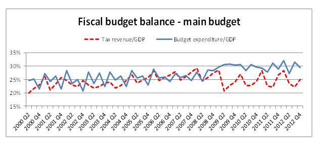 In the 2013 Budget, the main budget expenditure is estimated at 30.1% of GDP. This exceeds the expenditure averages since 2000 by 3.3 percentage points. As noted above, this appears to be a non-cyclical, structural increase. Tax revenue for 2012/13 is estimated at 25.2% of GDP, which is close to the average for 2000-2004 but is almost 2 percentage points below the averages attained during the commodity boom of 2004-2008. This shows a clear cyclical pattern in revenue, and a clear cyclical decline after 2008.