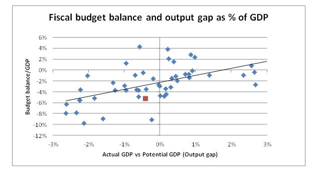 The highlighted red square in figure 2 shows the 2012 quarterly average values of the budget deficit as a percentage of GDP against the real output gap.