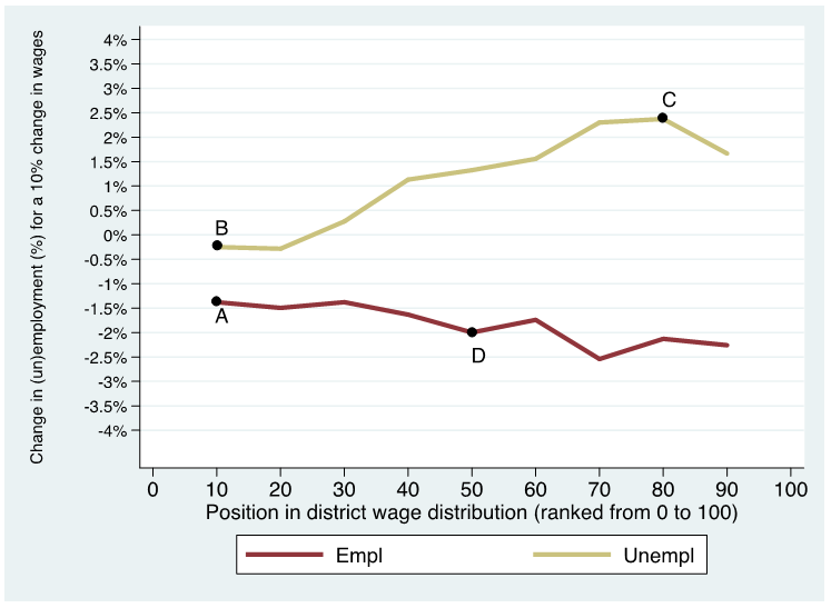 Similarly, the yellow line illustrates that unemployment (as a percentage of all the people who are willing to accept jobs within districts) increases more sharply if the wages of better-paid workers are increased, compared to when those of low-wage workers are increased. For the same 10 per cent wage increase of the lowest paid workers, the overall unemployment rate remains virtually unchanged (point B). Contrast this with the top 20% of wage earners (at point C) where job losses are estimated to be much greater: following a 10 per cent wage increase here, the overall unemployment rate would increase by almost 2.5 per cent.