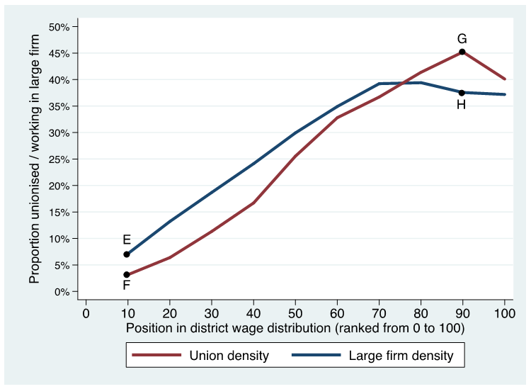 Why this result, which is so contrary to the common contention that unskilled wage increases are the major cause of job losses? Figure 2 shows some characteristics of the sampled workers along the pay scale. Better-paid workers are more likely to live in districts that are highly unionised and where large firms are the dominant employers (see points G and H, where about 40% of workers match these criteria). In contrast, the lowest-paid workers tend to live in districts with lower concentrations of large firms and less unionisation (points E and F). Generally, large firms and dominant unions tend to establish collective bargaining councils that exert a substantial influence on wage increases. As shown in earlier work, in making their wage demands, unionized and large-firm workers are less responsive to local labour-market conditions than non-unionized and small-firm workers (see my 2015 Econ3x3 article).