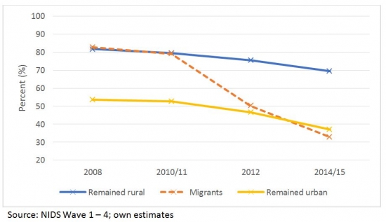 Figure 1 shows the impact of the decision to move from a rural to an urban area in South Africa on income poverty, based upon estimates from the NIDS data between 2008 (wave 1) to 2014 (wave 4). The NIDS tracks individuals over time, which allows us to compile compelling evidence about their ‘before’ and ‘after’ status when they migrate. We calculate changes in the poverty rate for three groups: those who remained in rural areas (blue line), those in urban areas all the time (yellow line), and those who migrated from rural to urban areas[2] (dashed orange line). Whilst those who stayed where they were experienced a slight decline in poverty rates, those who migrated to an urban area experienced a sizeable decline, crossing the stark divide between rural and urban poverty levels.