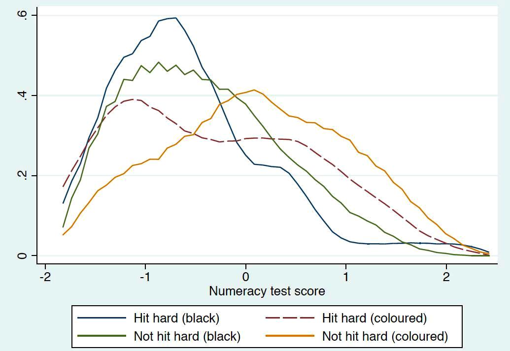 First, the test scores exhibit large racial differences: for example, for those who were not hit hard, the average scores of black youth (green line) are much lower (and concentrated around a lower score) than their coloured counterparts (yellow line).