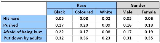 A higher proportion of the coloured youth have been hit hard, pushed and put down by adults (i.e. being undermined psychologically) compared with the other groups; and a higher proportion of girls were maltreated than boys. (The latter may reflect differences in the ways in which boys and girls report the violence and is consistent with national trends on family violence such as the National Youth Victimisation Study).