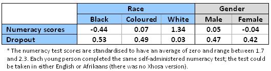 Numeracy test scores exhibit clear racial differences and the performance of female youth is lower than males’ performance. The dropout measure also shows clear differences across race and gender: black youth have the highest dropout rate (53%), followed by coloured (49%) and white (3%) youth, and dropout rates are higher for males.