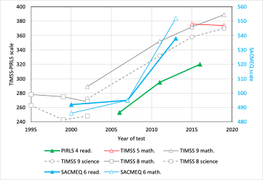 South Africa has experienced more than its fair share of inaccurate measurement, but in both major instances where this occurred, corrections were made fairly timeously. In 2016, preliminary results from the SACMEQ[6]programme were presented to a parliamentary committee. These results reflected an unbelievably large improvement between 2007 and 2013. Following concerns about the accuracy of this and about a lack of transparency around methods used, the data were revisited and new trends published. In the case of South Africa, the steepness of the improvement was halved. It was still impressive, but now also more believable within the wider historical context.