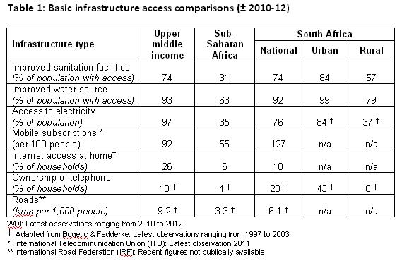 The National Development Plan (NDP) of 2012 highlights differences between urban and rural areas with regard to access to basic infrastructure services, and their quality. While backlogs are a challenge to the reform of rural infrastructure, they also inhibit economic and social inclusion in rural areas (NPC 2011:44). Bogetic and Fedderke (2005) show that South African urban areas are generally well-serviced in terms of electricity; water and sanitation; information and communication (ICT); and transportation, while their rural counterparts fall significantly short in these respects.