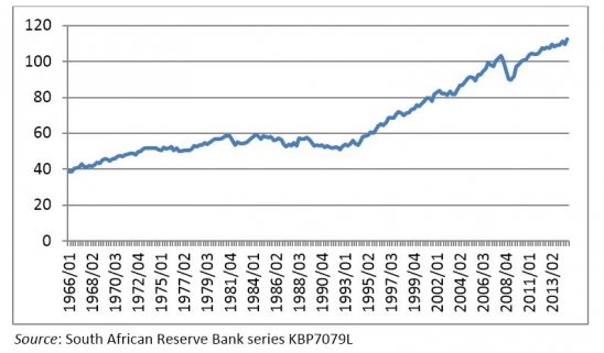 Countries get richer by becoming more productive – in other words, by producing more output with the same or fewer inputs. Individuals get richer if this higher productivity is translated into higher incomes. Figure 1 shows the growth in labour productivity in manufacturing since 1966 (where labour productivity is measured as the amount of gross output per unit of labour input). It is evident that South African labour productivity grew substantially in the first twenty years of democracy. But is this unequivocally good?