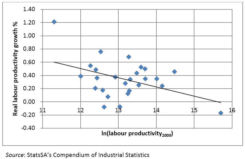 The paper starts by using industry-level data from Statistics SA on average labour productivity and wages across the different industries in the manufacturing sector. For the period since 2003, this data (see Figure 2) shows that, in industries with lower initial levels of labour productivity, labour productivity grew more quickly than in those with higher initial levels. These low labour-productivity industries also initially had the lowest average wages.