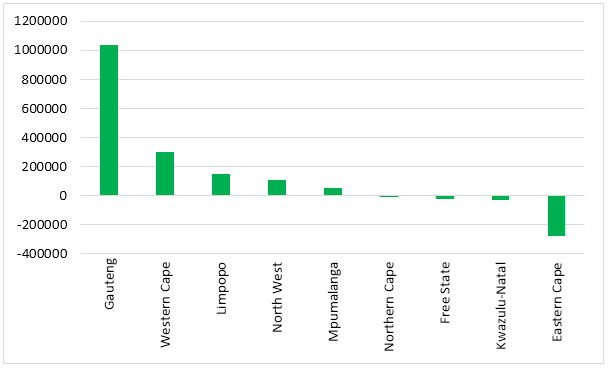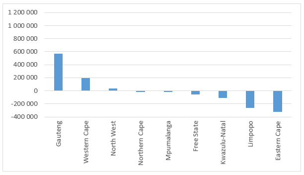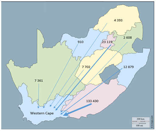 The results of the 2011 Census (StatsSA 2012a) show that, for the period 2001 to 2011, net inter-provincial migration for the Western Cape was 192 000 – the greatest contributor being the Eastern Cape (133 000), followed by Gauteng (23 000) and KZN (13 000). This amounts to an addition of 19 200 individuals per year between 2001 and 2011. These numbers and those in the map below only pertain to internal migration between the Western Cape and other provinces. Movements of people into the country (immigration) and out of the country (emigration) are not reflected.