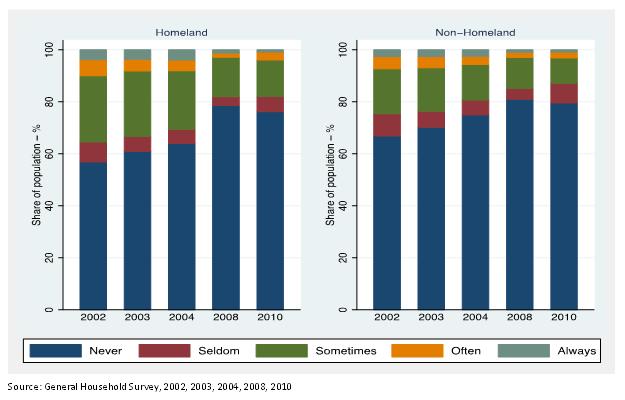 Figure 1 shows a clear increase in the percentage of African households in which adults ‘never’ went hungry from 2002 onwards – in both the former homelands and non-homeland areas. (Results for child hunger are similar and not shown here.) Roughly speaking, this percentage increased from approximately 60% in 2002 to 80% in 2008/2010 (compare the blue parts of the vertical bars). This is the general picture highlighted by Van der Berg et al., noted above.