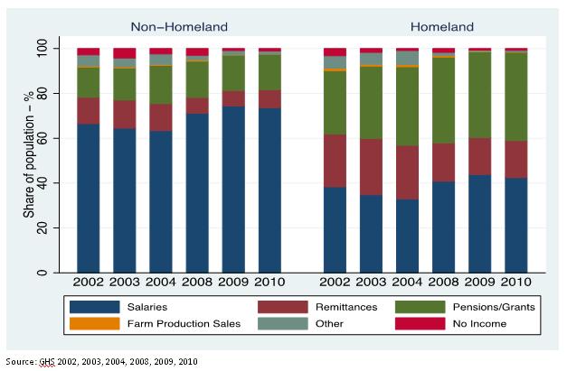 From 2002 to 2010, the share of grants in the income of African households in former homeland areas has increased significantly: from about 30% in 2002 to 40% in 2010 (while the share of remittances has shrunk). For non-homeland areas, the share of grants has increased only marginally (and has been substantially lower than that for homeland areas all the time).