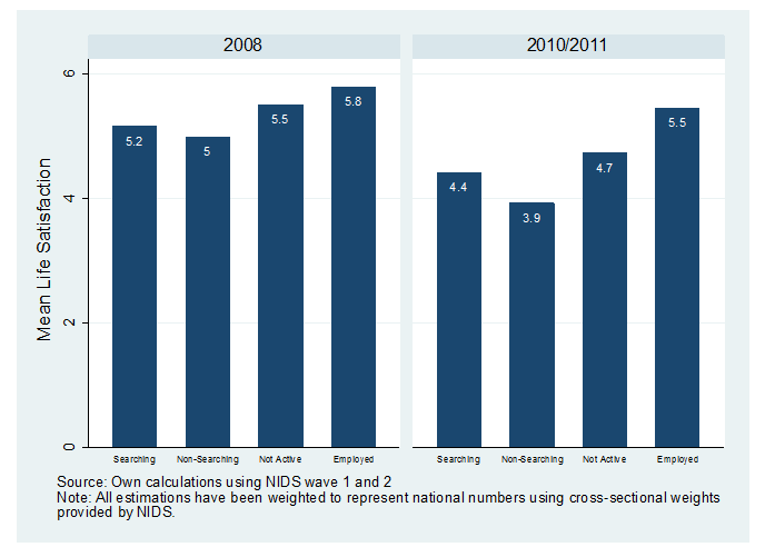 When we re-examined this issue using contemporary data from the National Income Dynamics Study,[1] we find new, and better, evidence that the non-searching unemployed are equally, or even more, ‘unhappy’ than the searching unemployed. Indeed, their life satisfaction has hit rock bottom. Based on these considerations, there are no grounds for excluding the non-searching unemployed from measures of unemployment.