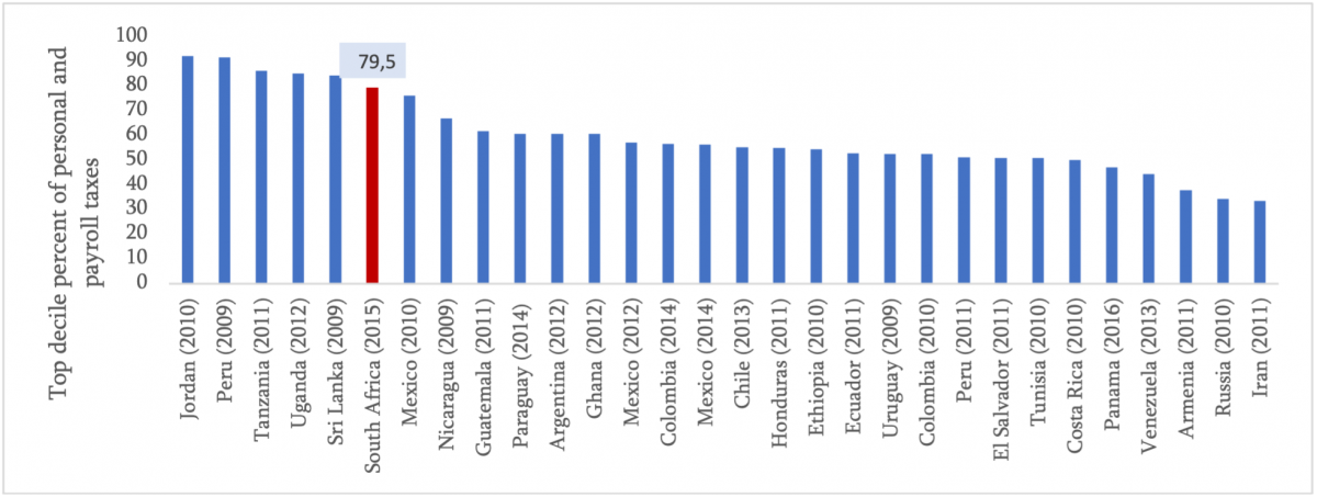 We show that the South African PIT is strongly progressive.[12] Among developing countries, it is one the largest as a percent of GDP, and it is concentrated amongst the top two income deciles Using comparative data from the Commitment to Equity Institute’s Data Centre (CEQ), we show that the burden, as a share of market income, on the richest decile is higher only in Tunisia. While there are a number of countries in the database that collect a larger proportion of the tax from the richest decile than South Africa, the size of the tax collection is smaller, reducing the burden on the richest deciles (as a share of income).