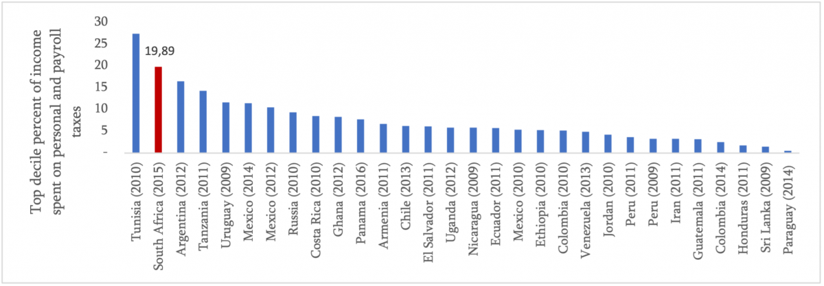 South Africa’s top decile pays 79.5% of the Personal and Payroll taxes. This is strongly concentrated in the top decile compared with other countries assessed by the CEQ Institute, but still lower than Jordan, Peru, Tanzania, Uganda, and Sri Lanka (Figure 1a). Unusual, however, is the incidence[17] of the tax in the top decile. South Africa’s top decile spends 20% of its market income on personal and payroll tax, second only to Tunisia in 2010 at 27%. (Figure 1b).