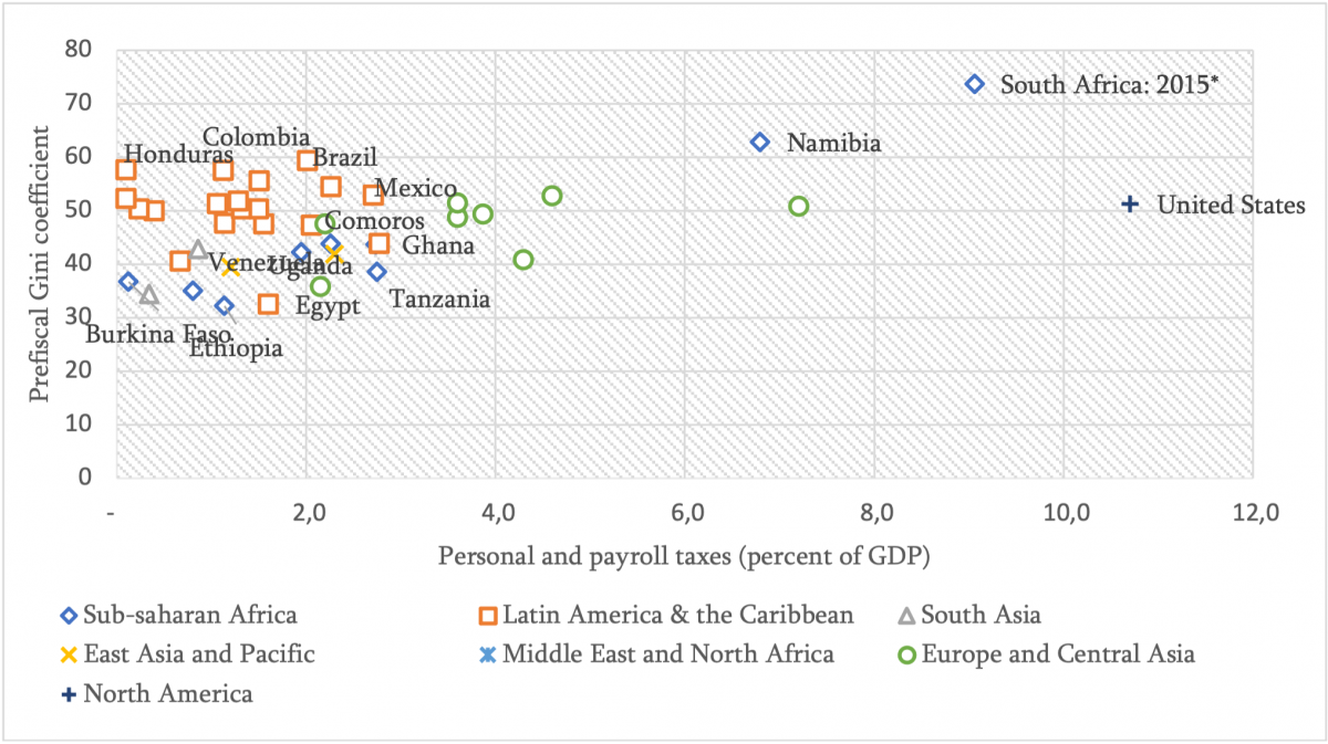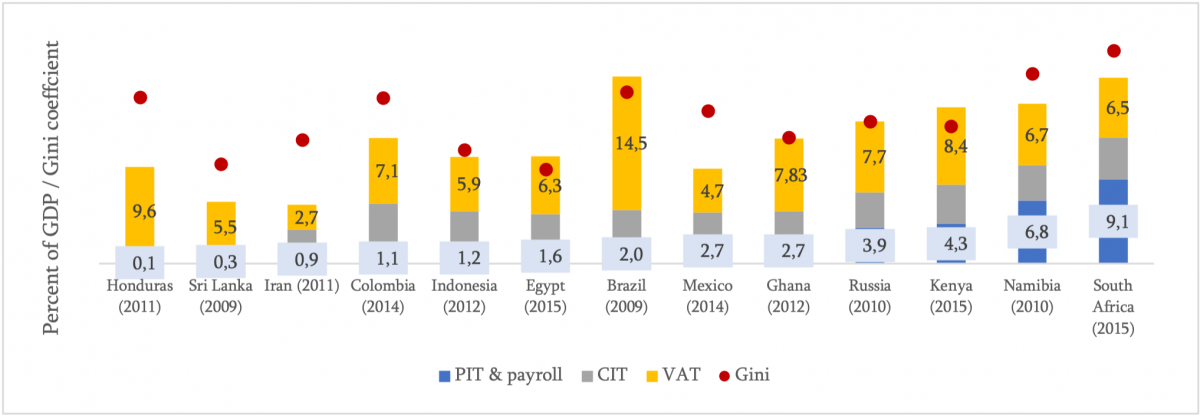 If we examine this on a graph that also shows levels of inequality prior to fiscal intervention (pre-fiscal inequality in the terminology of the CEQI), we see that while there are many Latin America and Caribbean countries with similarly high levels of inequality, they don’t use direct taxes as a means of redistribution in the same way South Africa does (Figure 2a). Many - such as Brazil, Colombia, and Honduras – instead use VAT as their primary tax collection (Figure 2a, 2b).