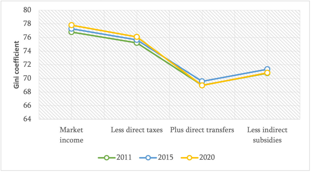 While market-income inequality is highest in 2020, this gap narrows slightly when we subtract the direct taxes from market income (including personal income tax). If we include the layer of direct transfers to market income less direct taxes (social grants, near-cash housing transfers, and free basic services), we find that inequality in 2020 dips below 2015 to the level of 2011, showing that fiscal policy fully compensates for the increase in market inequality.[18]