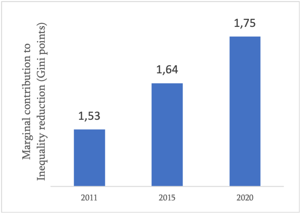 We see from Figure 5 that the income tax is having to work harder over time to reduce inequality. Its impact goes from a reduction of 1.53 (in 2011) to 1.75 Gini points (in our 2020 simulation).