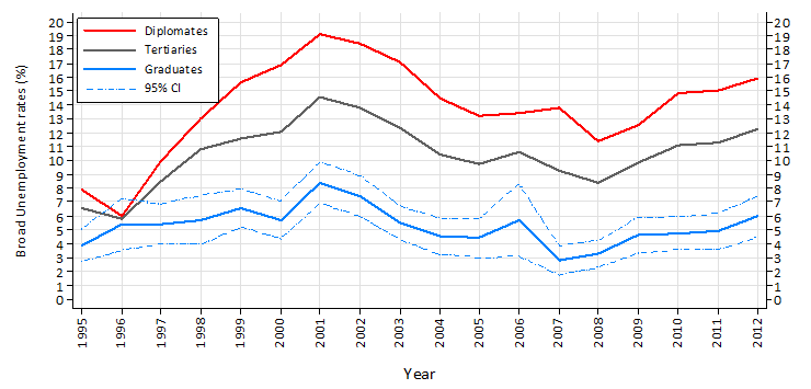 Moreover, one cannot deduce, from the fact that measured graduate unemployment levels apparently rose over the period, that graduate unemployment was on a (continuously) rising trend. As figure 1 (below) shows, broad unemployment rates among both diplomates and graduates actually peaked in 2001. By 2005 the broad unemployment rate for both had already been declining for some time; for graduates it had almost dropped back to its 1995-level.