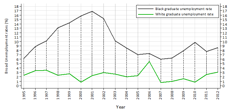 Nevertheless, there are still large differences in the unemployment rates for white and black graduates. This is illustrated in figure 2, which shows that over the period 1995 to 2012, the estimated broad unemployment rate of black graduates has consistently been much higher than among white graduates, particularly in the late 1990s and early 2000s.