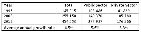 The number of employed black graduates has increased greatly since 1995. Table 1 shows that black graduate employment grew, on average, by 6% per annum over the 17-year period – from 145 000 in 1995 to 454 000 in 2012. Moreover, contrary to most expectations, the vast majority of this growth occurred in the private sector. While black graduates employed in the public sector more than doubled between 1995 and 2012, the number employed in the private sector increased more than four-fold and is likely soon to outstrip the number of publicly employed black graduates.