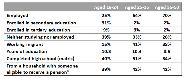 - While more than 60% of those aged 25‐35 and 36‐50 are reported to be employed, only 25% of men in the youngest age category work.