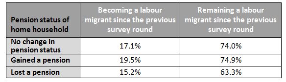 On the other hand, current labour migrants apparently had enough money to overcome financial constraints and thus were able to migrate. If their household were to gain a pension, we would not expect much of an effect on their decision to work. However, the loss of a previously-received pension may force such labour migrants to return to their rural homes, if their sharing in the pension had enabled them to look for and retain a job.