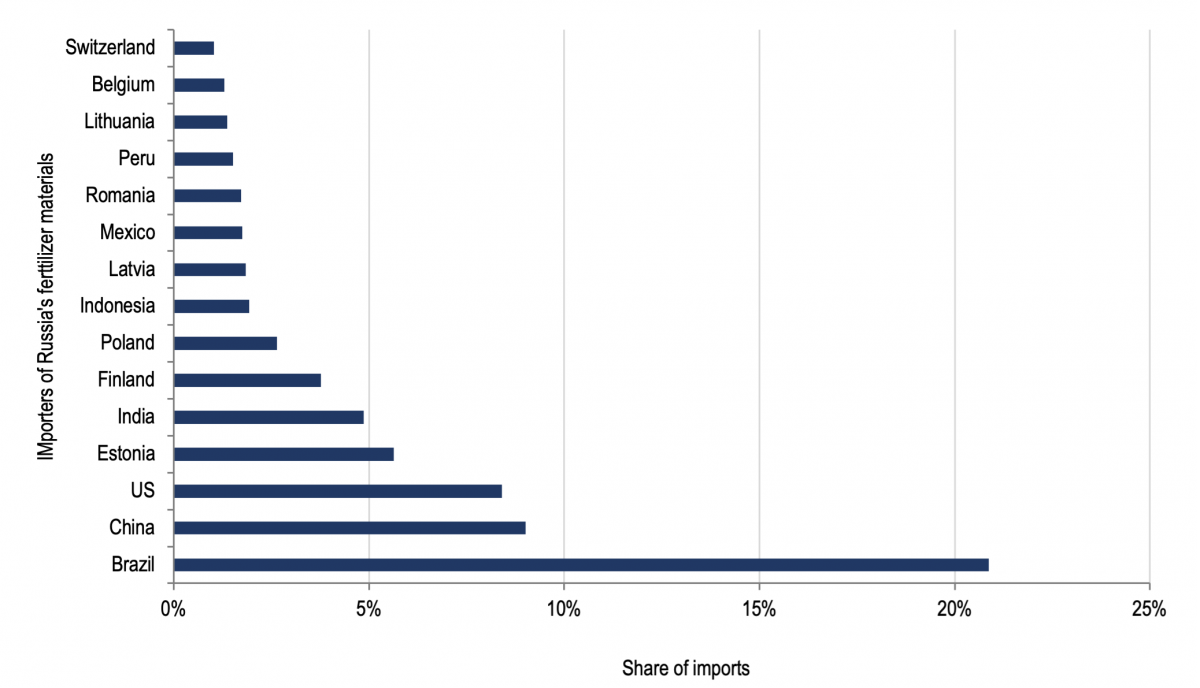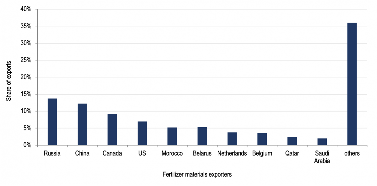 Russia is also integrated in global agriculture through inputs market, and here lies a major risk for import dependent countries such as South Africa. Russia is the world's leading exporter of fertilizer materials in value terms, followed by China, Canada, the US, Morocco, and Belarus (see Figure 1). These fertilizer mixtures include a variety of complex minerals and chemicals, including nitrogenous fertilizers, phosphoric fertilizers, and potassic fertilizers.