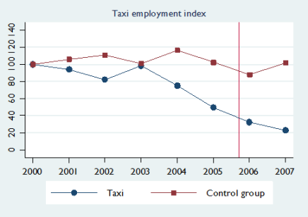 The only sector in which we see a significant decline in employment is the taxi sector – the smallest of the affected sectors. However, as figure 2 shows, this decline was amidst a decline that had started two to three years earlier; and the control group also experienced a decline around 2004-6. Thus it is not clear whether, or to what extent, the drop in employment in the taxi sector can be attributed to the introduction of minimum wages.
