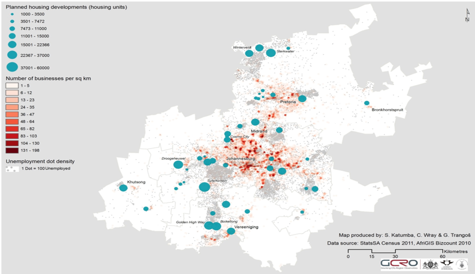 Richard Ballard of the Gauteng City Region Observatory showed a map (figure 1 below) of the proposed new housing megaprojects in Gauteng. The red areas shows the concentration of existing businesses. The blue dots show the planned housing developments (with larger dots indicating a larger number of housing units). All of the developments are far from existing businesses and employment opportunities.