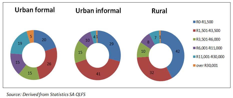 Figure 2: Monthly income profile of employed adults by type of residential area (%), 2013