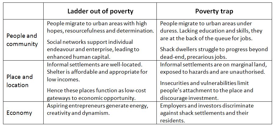 Drawing on the international literature, it is possible to distil two contrasting perspectives on shack areas. They are summarised in table 1 on the basis of the three dimensions shown in the left column. Note that any particular settlement is likely to reflect some mixture of the two. The balance is bound to vary depending on labour-market conditions, population growth and the location of the settlement.