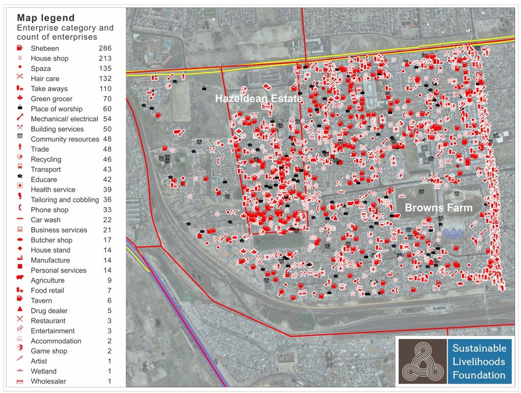 The research involved a so-called small-area census in each of five residential townships around Cape Town (see Charman et al. 2015). The investigation, done between November 2010 and February 2013, aimed to identify and record all economic activities and micro-enterprises, even those that were not necessarily recognisable businesses as such but which were run for economic survival or to supplement household income. The sites surveyed – Brown’s Farm, Delft South, Imizamo Yethu, Sweet Home Farm and Vrygrond – comprise a range of formal and informal residential settings.