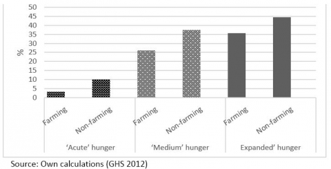 Starting with acute hunger, only about 3% of food-poor farming households in the Eastern Cape report this most severe form of food insecurity compared with about 10% of food-poor households that do not farm. As the measure of hunger frequency becomes wider, the difference in the risk of hunger between farming and non-farming households remains. For all households with a medium occurrence of hunger (i.e. only experiencing hunger ‘sometimes’), just over a quarter of farming households and 37% on non-farming households report hunger. Even when using the widest (expanded) measure of hunger frequency, we still find that the poorest households are less likely to ever experience hunger if they farm in some way.