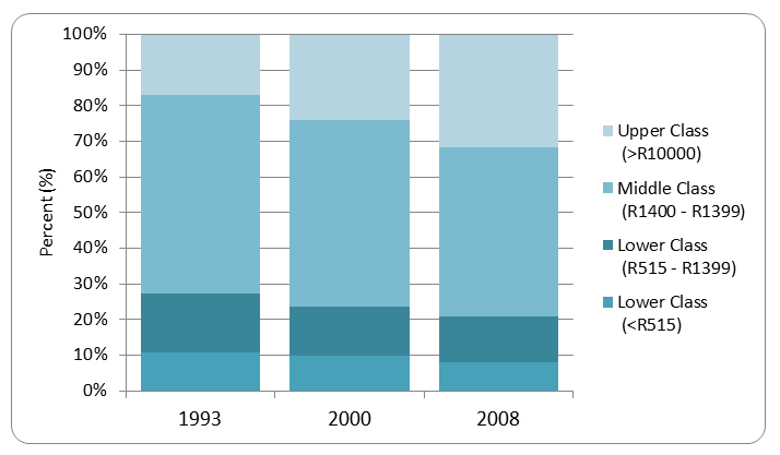 In this article, I track the changes that have taken place in these two different ‘middle class’ groups since 1993 and ask: have they been becoming better off? The answer to this question provides a novel insight into changes in the income landscape in the country. I use data from the Project for Statistics and Living Standards 1993, the Income and Expenditure Survey 2000 and the National Income Dynamics Study 2008[1] (three nationally representative household income surveys) to tell this story.
