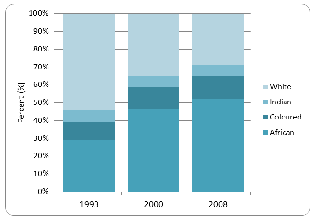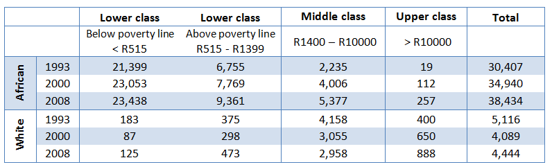 As shown in figure 2 below, the net result was a significant shift in the racial composition of the middle class: from a white majority in 1993 to an African majority by the end of the period. Falling numbers of middle-class whites are partly a function of the shrinking white population, also driven by high levels of white emigration particularly between 1993 and 2000. However, a small but notable number of whites have also moved into the upper class.