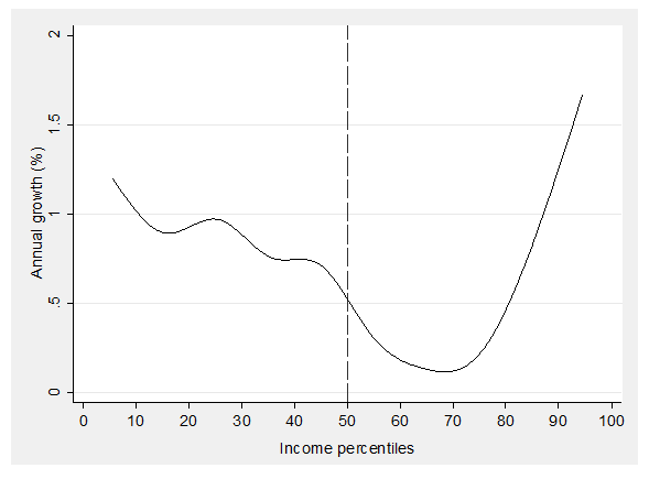What is striking in South Africa is the U-shape of the curve – meaning that there is a polarised pattern of growth. For example, households in the lowest income groups (say at the 10% point) experienced an annual growth in real income of approximately 1%, while those in the highest income groups (say at 90%), experienced a growth in real income of approximately 1.5 per year. In contrast, those roughly in the middle had the lowest income growth by far. Many households in the middle (notably those just above the 50% point) experienced income growth rates around, or below, 0.5% per annum.