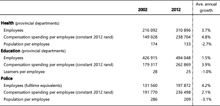 - Expansion of core government services: Health, education and policing are the most labour-intensive of government services, absorbing 50% of the national budget but more than 70% of compensation spending. Extending these services necessarily entails increasing employment levels. Between 2002 and 2012 police numbers increased by more than 50%, while employment in provincial health departments grew by 44% (see Table 1). In both cases, the population served on average by each employee fell significantly. The growth in education employment was more moderate but made similarly impressive gains relative to the number of enrolled learners.