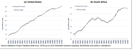 This difference can be seen when comparing patterns of growth in South Africa and the USA. (Figure 6). Until the mid-2000s, the USA’s growth rate shows a relatively linear trend, whereas the picture for South Africa is very different, with periodic accelerations and decelerations lasting over a decade or more. Solid output growth in the 1950s and 1960s is supplanted by falling GDP per capita, reflecting the structural crisis of the apartheid economy and coinciding with the turn in the commodity price cycle. In the 1990s, growth is restored and its momentum accelerates through the commodity boom. But another shift in the trajectory of growth appears to loom as the time series comes to an end in 2016.