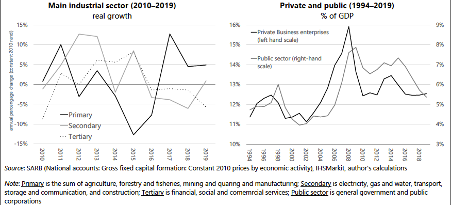 Had these expanded resource allocations led to sustained progress in the quality of public services and been accompanied by improved industrial investment, trade competitiveness and productivity, they might have formed part of a new dynamic of self-reinforcing growth and development. Had global dynamics remained supportive, the result might have been a sustainable fiscal path. Instead, the extension of fiscal commitments and surge in public infrastructure investment was followed by a permanent fall in GDP growth.