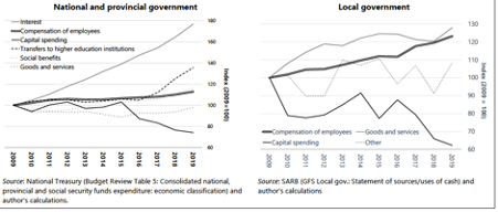 Tight expenditure control was not backed by explicit policy choices that would reduce spending. This led to a deterioration in the quality of public allocations and an erosion of the value of services. Interest payments outpaced the growth of all other spending and, after 2016, government added free university education to its fiscal obligations. This combination resulted in an implicit choice to constrain capital spending across all government spheres and hold down goods and services budgets as a share of GDP (see Figure 3).