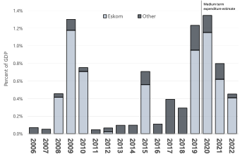 I have excluded “payments for financial assets” from the definition of ‘core expenditure’. They are dominated by transfers to Eskom – R60 billion between 2008 and 2010 in the form of a “subordinated loan” that was later converted to “equity”; further injections of “equity” in 2015 (R23 billion) and 2019 (R49 billion); and a further R112 billion promised for the next few years in the 2020 budget. (See Figure 7)