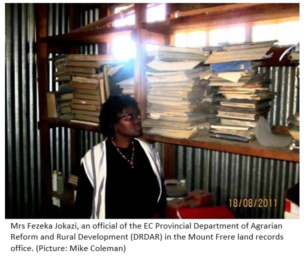 The building in which land records are stored in Mount Frere, a district of the old Transkei, is an iron shack. Rickety wooden shelves are weighed down by piles of ledgers and fraying folders. At a recent policy conference on inclusive growth, Mike Kenyon, a researcher in the Eastern Cape, showed a 2011 picture (below) of this land records ‘office’ to illustrate land administration in the former homeland. Despite intense economic activity in livestock farming, construction, personal services and even marijuana cultivation, there are few effective institutions and many murky regulations around land use and planning. ‘Anyone who wants to do a development project gives up or does it below the radar’, he said.