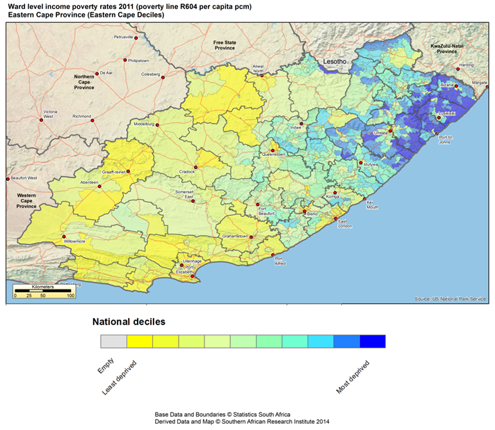 As with multiple deprivation, within the Eastern Cape the two former homeland areas are prominent, with the former Transkei being the worst off in terms of income-based poverty (having an average income poverty rate of 80% in 2011).