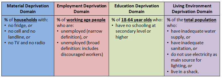 The SA Index of Multiple Deprivation for 2011 is a weighted combination of four domains of deprivation: material deprivation, employment deprivation, education deprivation and living environment deprivation (see Noble et al. 2013). Table 1 shows the relevant population and the indicators of deprivation for each.