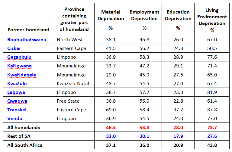 Deprivation rates for the rest of South Africa are dramatically lower than the average for the former homelands, with only 28% (against 74%) of the population being deprived in the living environment domain, 18% (against 28%) in the education domain, 30% (against 54%) in the employment domain – and 33% (against 46%) being in a situation of material deprivation. Former homelands, therefore, continue to carry a heavier burden of multiple deprivation than the rest of South Africa.