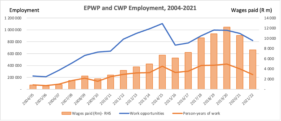 The EPWP Office estimates that wages paid on employment programmes increased from R823 million in 2004/05 to R6.7 billion in 2014/15, and then peaked at R12.2 billion in 2019/20 before falling back sharply during the 2020/21 and 2021/22 lockdown periods.