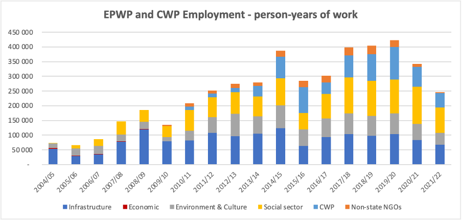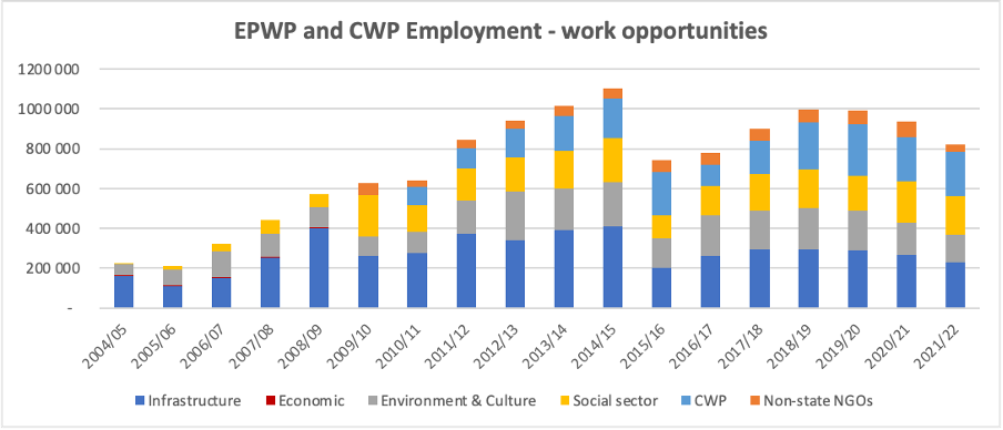 The official “Monitoring and Evaluation” (M & E) reports of the Expanded Public Works Programme (EPWP) published on the Department of Public Works and Infrastructure (DPWI) website provide a measure of progress against these targets.[1] The reports indicate that the 2015 goal was met in 2014/15, following a decade of broadly steady growth in the EPWP and the rapid growth of the Community Work Programme (CWP), first piloted in 2007 and introduced into these reports in 2010/11.